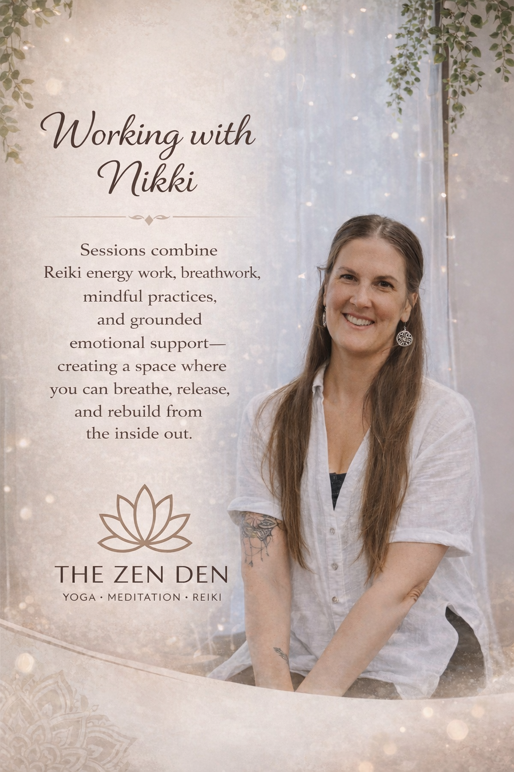 Through Reiki, Nikki helps calm your nervous system and clear energetic blocks so you feel lighter and more aligned. With Breathwork, she guides you into deeper awareness, helping you reconnect with your body and process emotions that may have been stored for years.